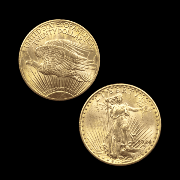 La 20 Dollars US se décline en plusieurs variantes majeures, qui structurent aujourd’hui le marché numismatique. La plus ancienne est la Liberty Head, frappée de 1849 à 1907, reconnaissable au profil de la Liberté portant un diadème. À partir de 1866, la devise IN GOD WE TRUST est ajoutée au revers, créant une distinction importante entre les versions « With Motto » et « No Motto ». En 1907, apparaît la mythique Saint-Gaudens, représentant la Liberté marchant, torche et rameau d’olivier en main, avec un revers à l’aigle en plein vol. Cette série elle-même se subdivise entre les types High Relief, très recherchés, et les frappes plus courantes à relief abaissé. À cela s’ajoutent les ateliers de frappe (Philadelphia, San Francisco, Denver), identifiables par des lettres, qui influencent fortement la rareté et la valeur de certaines années.