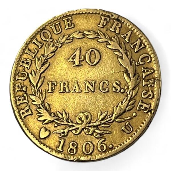Monnaie de 40 francs Napoléon Empereur. Pas commune, seulement 58,512 exemplaires frappés pour cet atelier Turinois! Et quel beau différent!