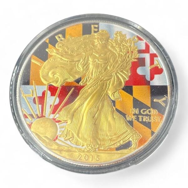 Très beau coffret limité avec sa monnaie de 1 oz / Once en couleur pour célébrer les états et drapeaux Americains (US flags – Etat du Maryland). Monnaie en Argent 999.9 – 1 dollar 2015 – USA